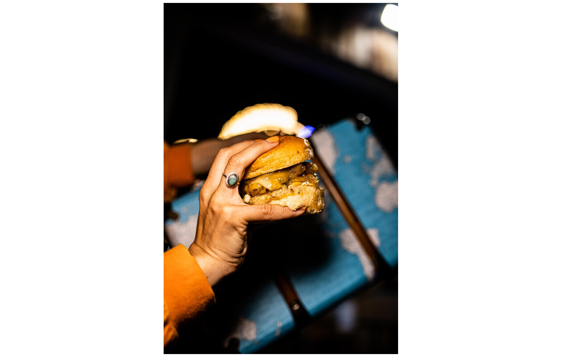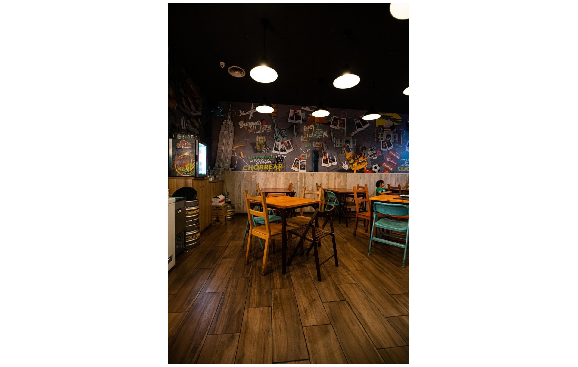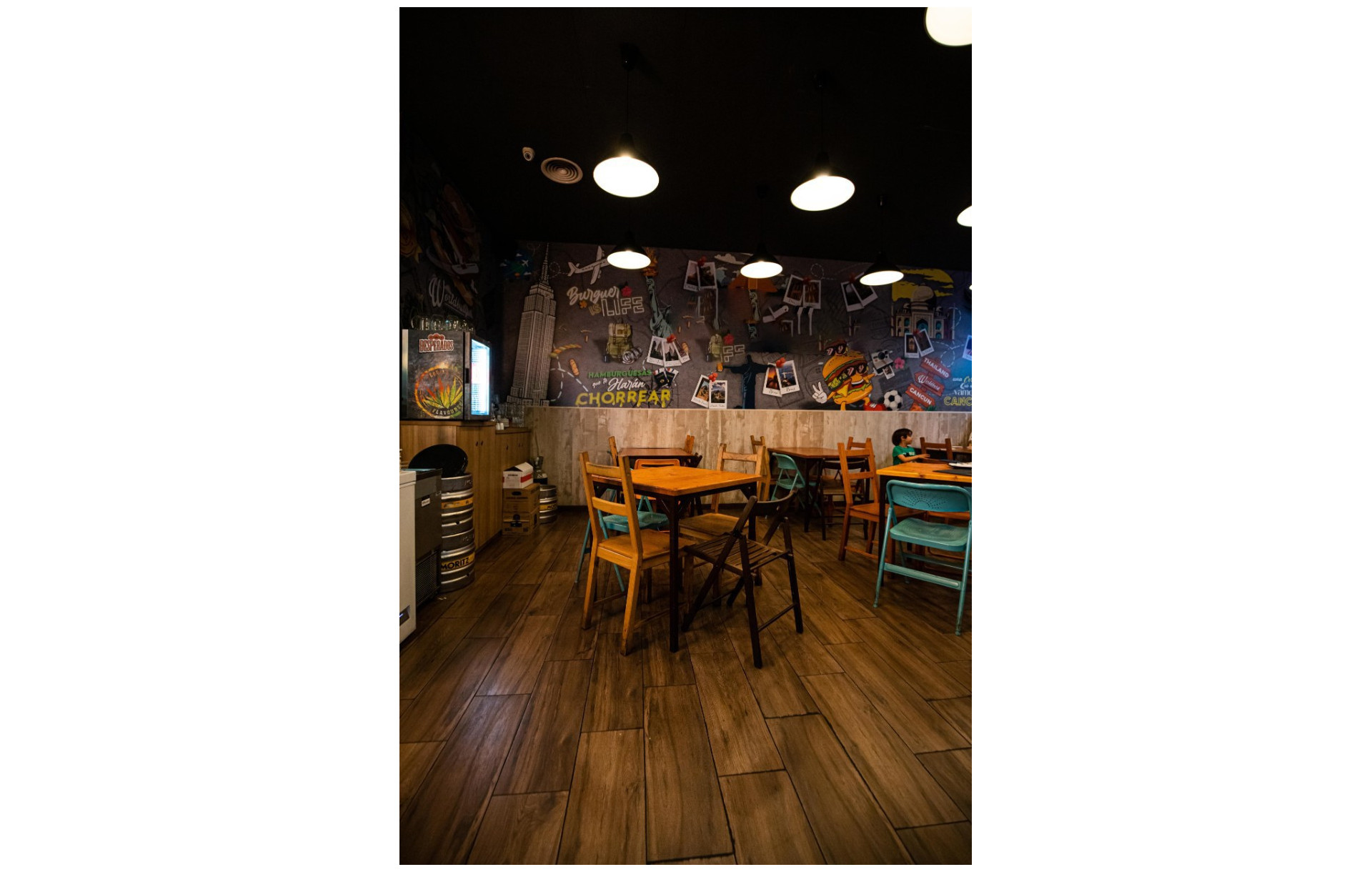 Cuenta con cocina a la vista, con una parrilla de un metro, campana extractora con potenciómetro, y mesa de trabajo refrigerado de 3 puertas.