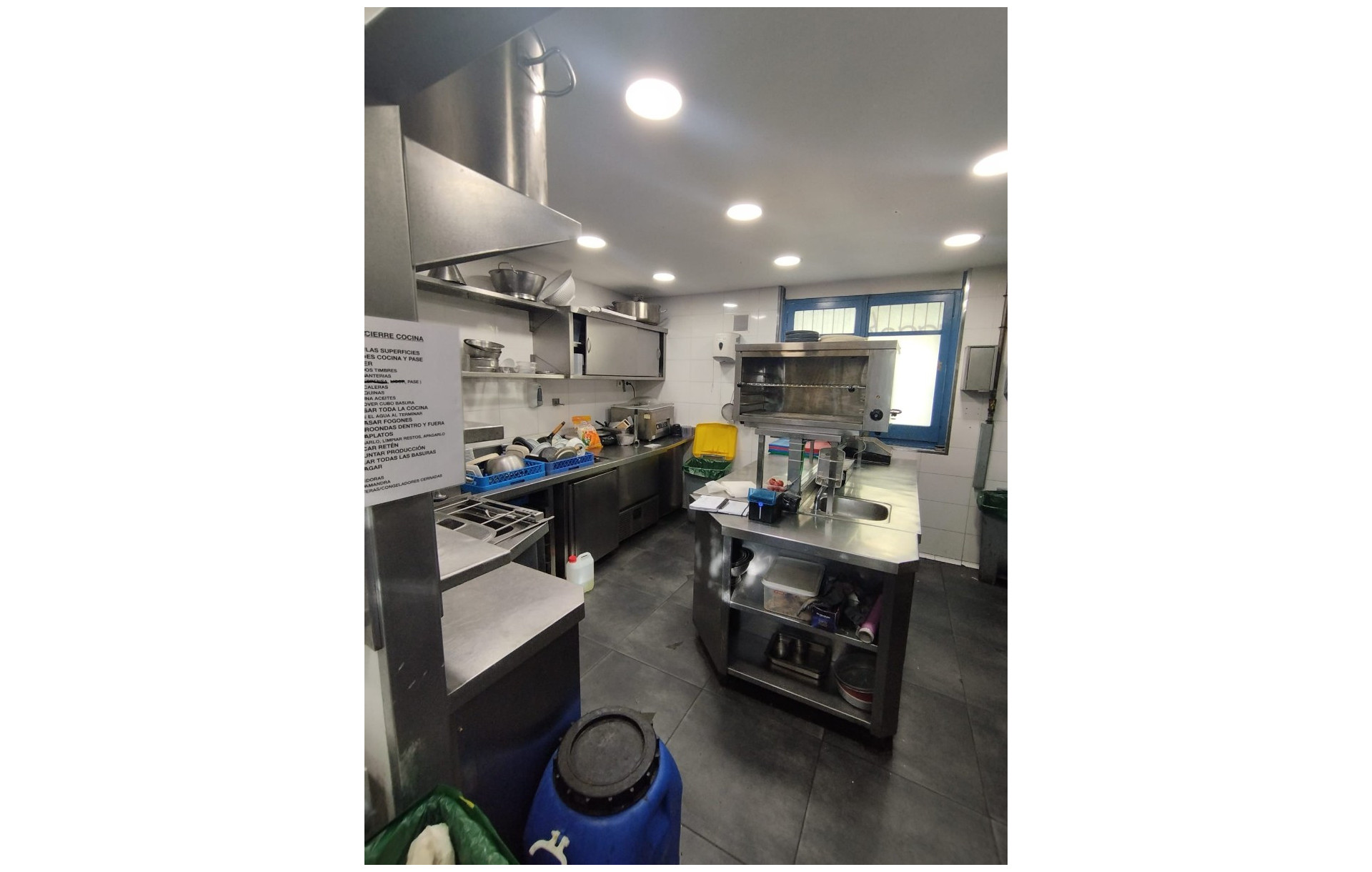 En cocina; 2 neveras ,1 arcón congelador , 2 congeladores, Lavaplatos ,1 Salamandra, 1 Horno josper ,1 Freidora de 2 cuerpos ,1 Freidora de 1 cuerpo ,1 cocina de 4 fogones ,1 Horno rational ,1Salamandra ,1 Envasadora ,la batería de cocina y utensilios ,1 microondas ,1 Abatidor ,1 Isla central con timbres debajo( 3 timbres por cada lado),1 Picadora.