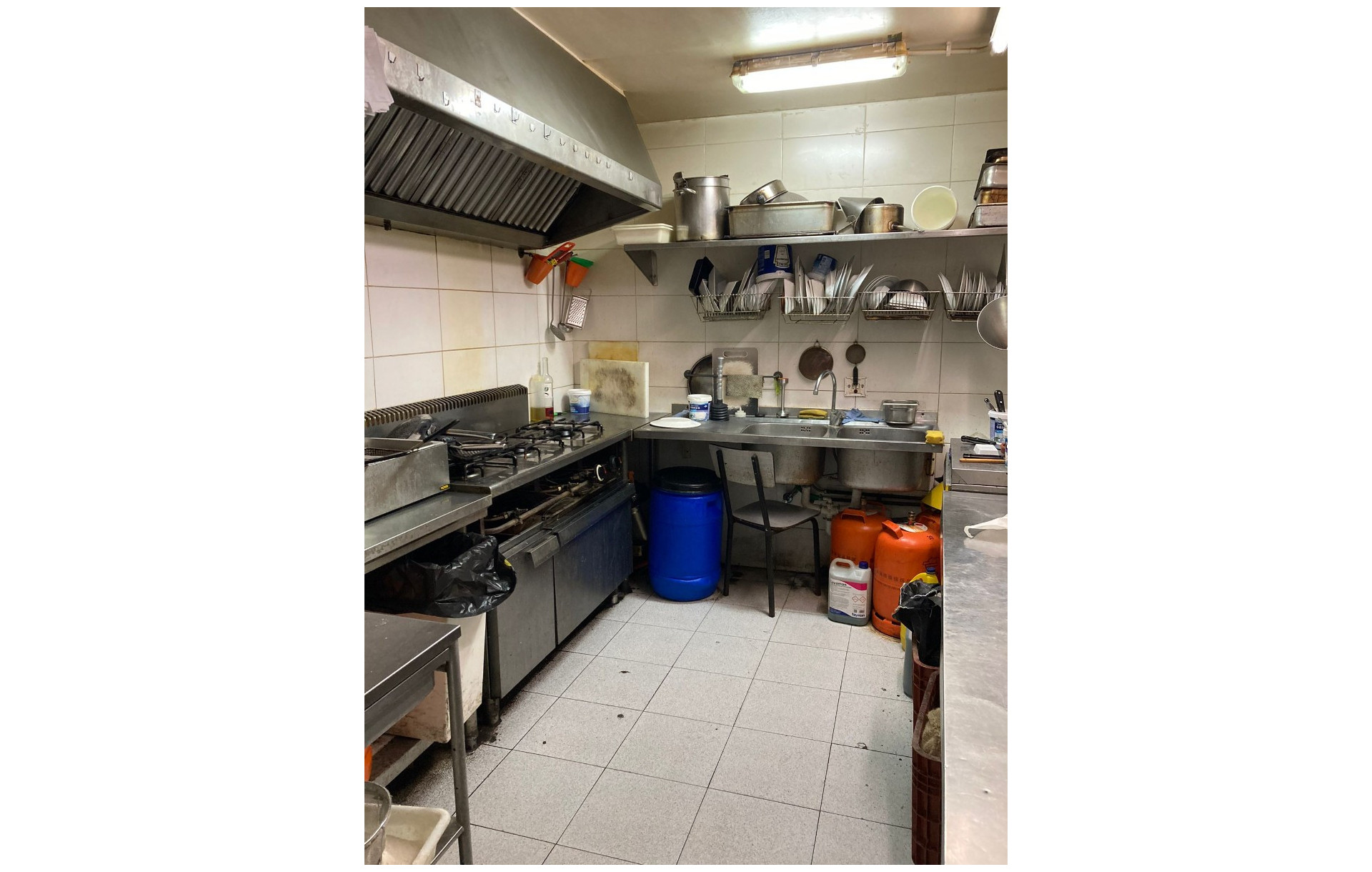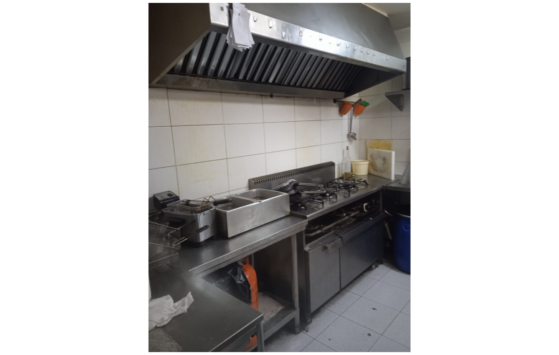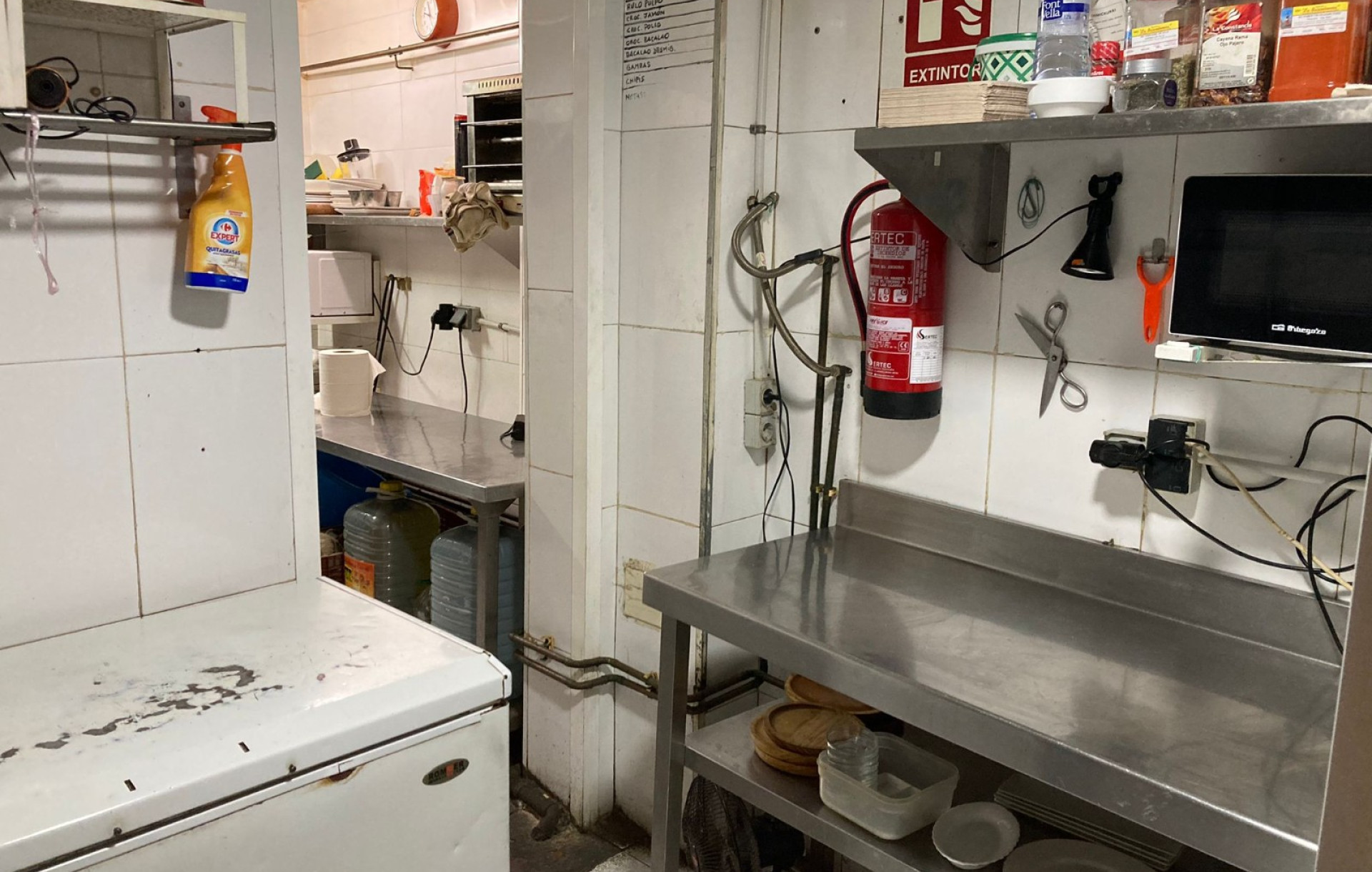 La barra está totalmente equipada con tpv, botellero de 4 puertas, lava vasos y cafetera. La cocina cuenta con campana extractora, cocina de 3 fuegos, 3 freidoras, 1 pica, 2 microondas, 1 corta fiambres, 1 nevera de 5 puertas, 1 arcón, 1 salamandra y mesas de trabajo. Aunque funciona con gas butano, existe la opción de conectarlo a gas natural.