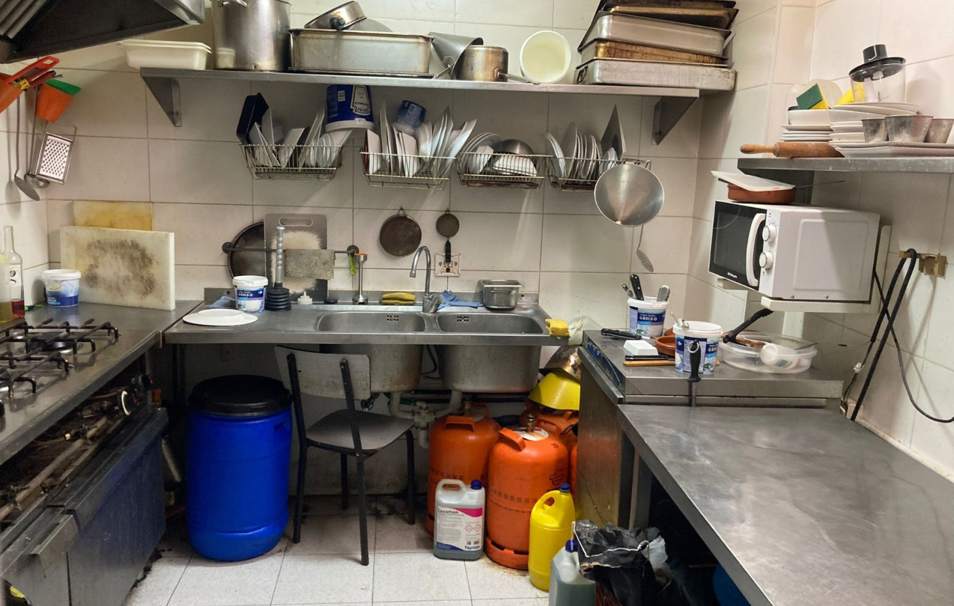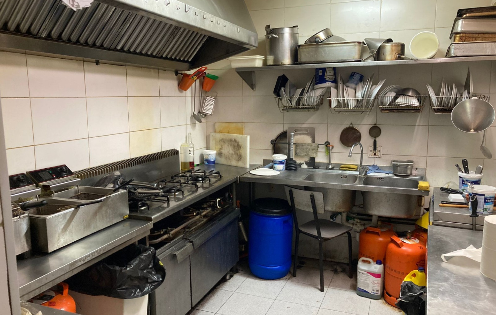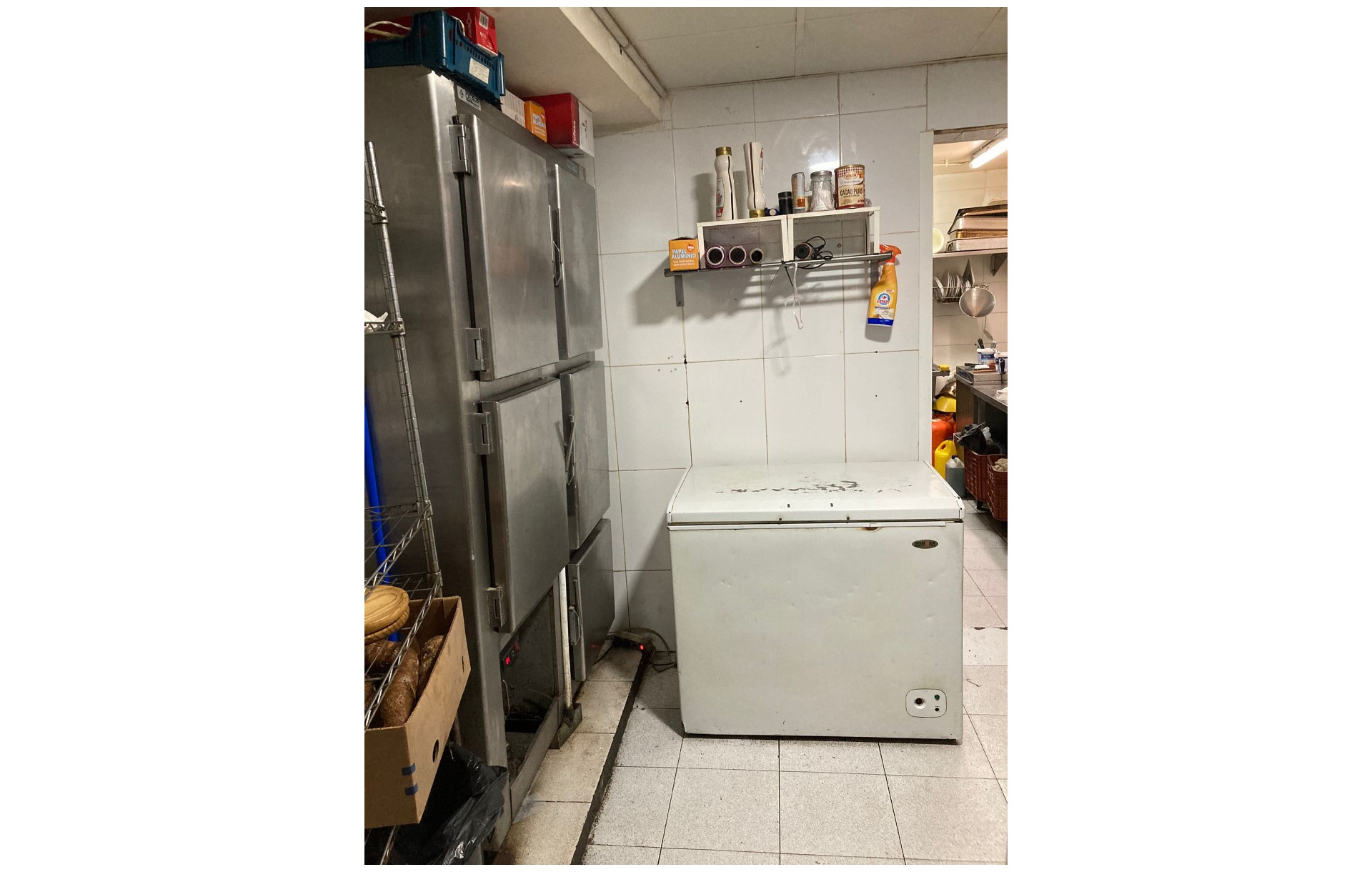 La barra está totalmente equipada con tpv, botellero de 4 puertas, lava vasos y cafetera. La cocina cuenta con campana extractora, cocina de 3 fuegos, 3 freidoras, 1 pica, 2 microondas, 1 corta fiambres, 1 nevera de 5 puertas, 1 arcón, 1 salamandra y mesas de trabajo. Aunque funciona con gas butano, existe la opción de conectarlo a gas natural.
